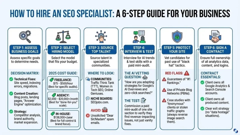 Hiring an SEO specialist in 2025 is a high-stakes decision—so here are the 6 steps to hiring an SEO specialist perfect for your business.